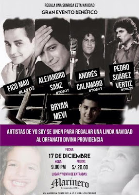 Hoy jueves 17 de diciembre a partir de las 9 pm en “Marinero “se unirán en un súper concierto Andrés Calamaro de Yo soy, Alejandro Sanz Yo soy ,Pedro Suarez Bertiz de Yo soy ,Fico Mau de La Voz Perú y Bryan Mevi conocido artista local .Todos juntos cantarán a beneficio del orfanato Divina Providencia para poder así celebrar la navidad a las niñas .
