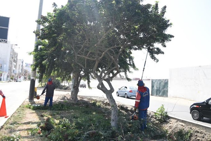 Personal de la Gerencia de Servicios Públicos y Desarrollo Social de la Municipalidad de Víctor Larco ejecutan trabajos de mantenimiento de las áreas verdes en la prolongación Vallejo, sectores el Golf y La Encalada.